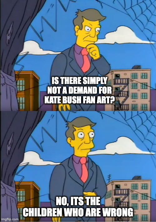 maybe you're asking why I'm reprinting my worst ever selling art print. because Kate Bush is incredible, that's why. A goddamned visionary. I was right a decade ago to release it even though nobody bought it, and I'm right again now. Thank you Stranger Things and Miss Roan for doing your part, its a communal effort and I appreciate it.